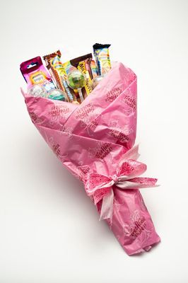 Forget flowers—this one's way sweeter. Our candy bouquet is packed with an assortment of chocolates, lollipops, and candy bars, all wrapped up in our signature pink TreeHouse Sweets paper and finished with a ribbon.